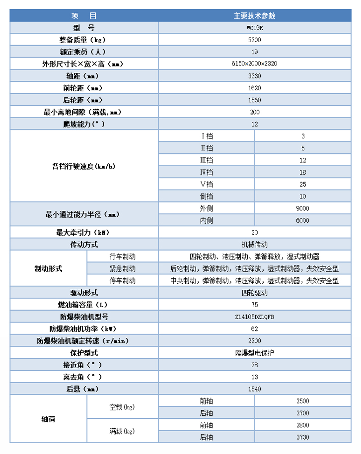 WC19R型防爆柴油機無軌膠輪車是我公司根據(jù)中小型煤礦井下的運輸實際要求研制開發(fā)的新型運載工具,是以具有國Ⅲ排放標準、增壓中冷、電控高壓共軌噴射型式的ZL4105DZLQFB氣起動防爆柴油機為動力、輸出功率分別為62kW、機械傳動、濕式制動、四輪驅(qū)動的煤礦井下無軌式運輸機械。相比較電起動具有如下特點: 1、能無級調(diào)速?刂茐嚎s空氣流量、壓力,即可調(diào)節(jié)氣動起動機的功率和轉(zhuǎn)速。 2、安全可靠。避免了電起動時的冒火現(xiàn)象。 3、過載能力大,具有較高的起動轉(zhuǎn)矩。 4、操作維修簡單、對惡劣氣候環(huán)境適應性好,不怕雨淋受潮。 濕式制動系統(tǒng)升級為工作制動、緊急制動、停車制動三套各自獨立的機構(gòu)。工作制動為濕式制動器,緊急制動和停車制動為安全失效型,當壓力消失時,系統(tǒng)處于制動狀態(tài)。使車輛更加安全可靠。為煤礦井下安全生產(chǎn)提供可靠保證。 車架采用載重汽車專用優(yōu)質(zhì)碳素結(jié)構(gòu)鋼510L軋制型鋼為原材料的鉚接車架,前后鋼板座用材為ZG350-470鑄造機座,進一步保證了機架終生不出現(xiàn)疲勞損壞。 主要原材料和零部件采用國內(nèi)知名企業(yè)生產(chǎn),質(zhì)量保證。